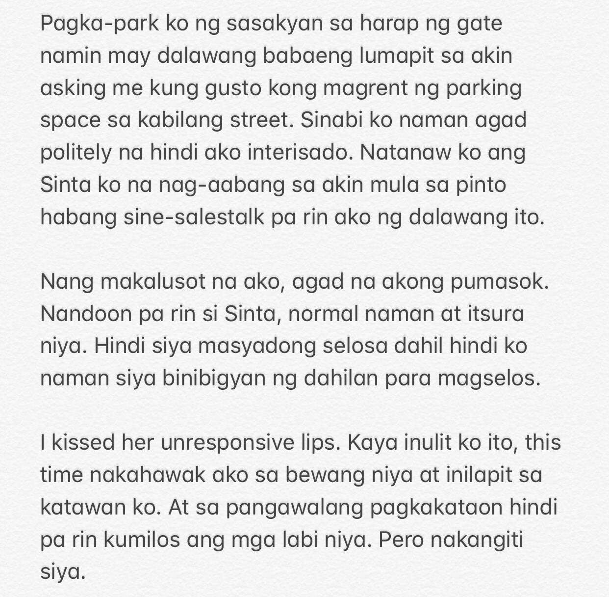 Straight ako Sabi ko pero ngumisi lang siya bago ilapit sa akin ang mukha niya. Wala pa kaming kotse. Gaya ng araw-araw kong ginagawa nadadaanan ko ang natagas na tubig sa may pader itinatapat ko ang malapit nang mamatay na halaman tinutulungan ang matanda na buhatin ang kaniyang kariton upang.