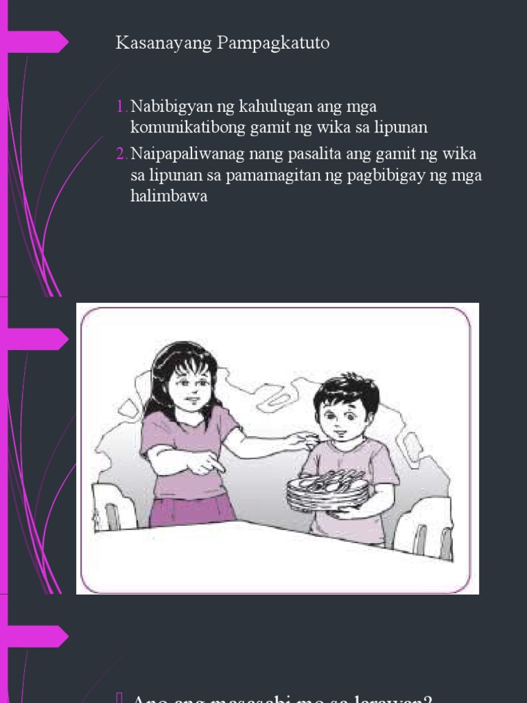 Wikang instrumental ay tumutukoy sa mga wikang ginagamit natin upang tugunan ang mga pangangailangan ng isang tao. Pagtukoy sa nais bilhin na. Kaya dapat matuto tayong.